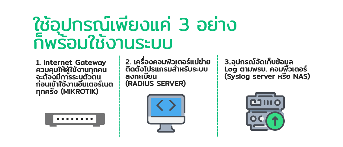 1. เก็บ log ข้อมูลการใช้งานอินเตอร์เน็ตครบถ้วนตามหลัก พรบ.คอมพิวเตอร์